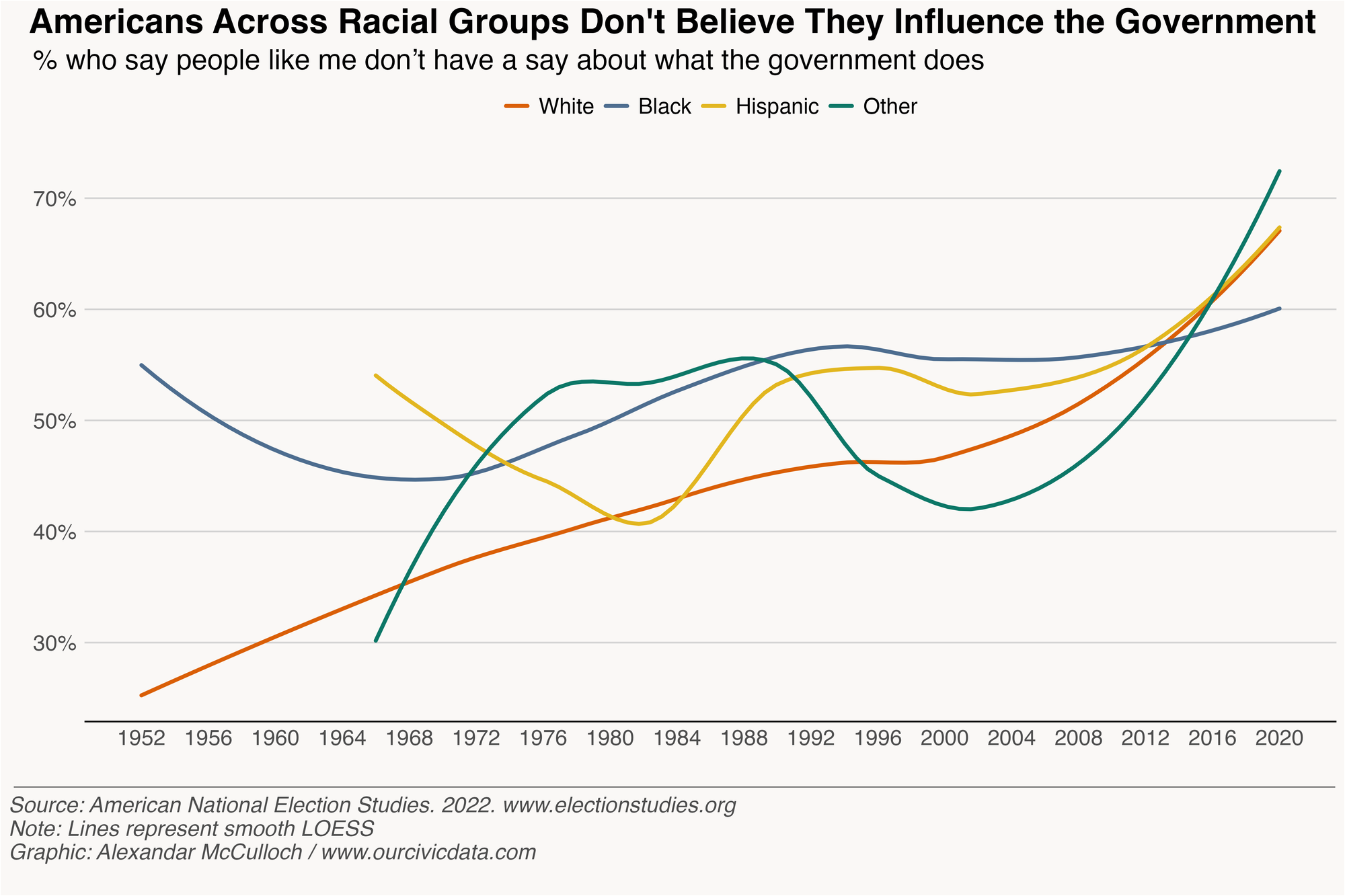 This apathy transcends partisan politics, race, and the "loser" effect. There was a time when marginalized groups reported a distinct experience separate from White voters, who are overwhelmingly represented in government. By 2020, a minimum of 60% of White, Black, and Hispanic voters report feeling unable to affect their government.