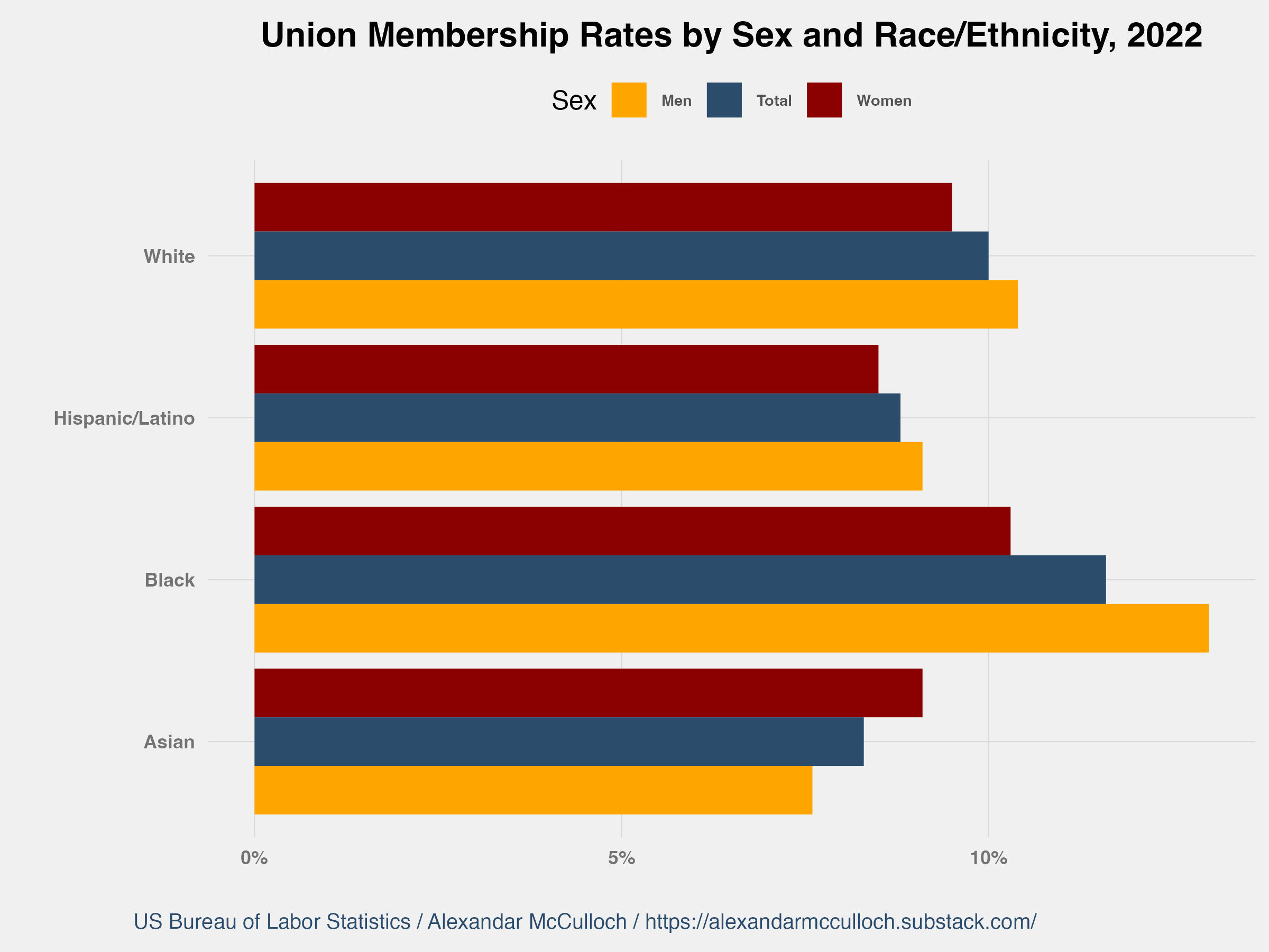 Nearly 12% of Black Americans were members of a labor union in 2022. That’s 2 points higher than White Americans who are second on this list. It was Black men in particular who led the pack, with 13% being members.