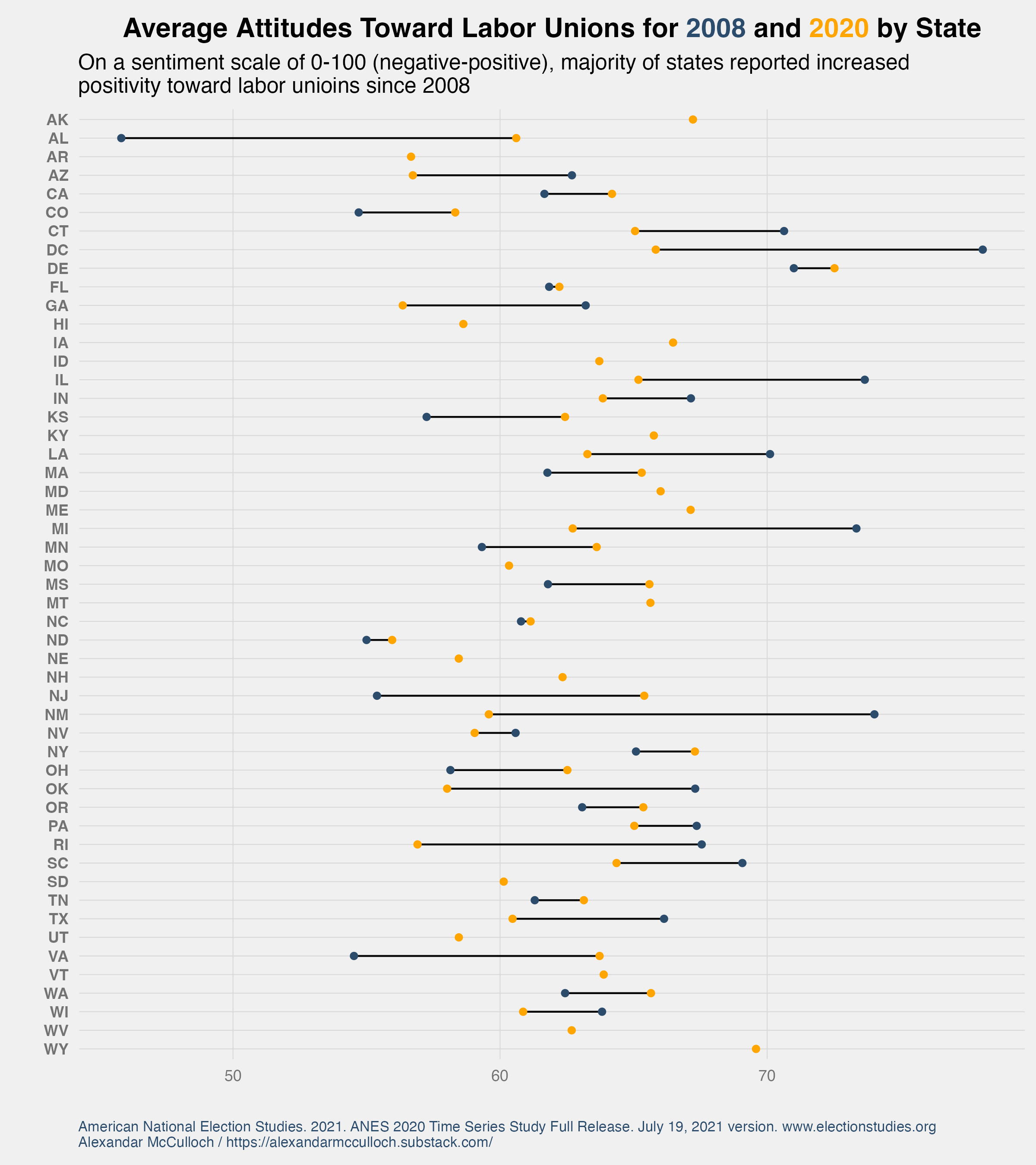 The most significant increase in positive sentiment toward unions was observed among Alabamians, who saw their average score rise from 45.8 in 2008 to 60.6 in 2020. On the other hand, New Mexico experienced the most substantial decline in sentiment, moving from 74 in 2008 to 59.5 in 2020. Among the 33 states plus the District of Columbia that reported data for both 2008 and 2020, a total of 16 states witnessed a decrease in sentiment scores. These states are distributed across various regions, including the South, Midwest, Southwest, and Northeast. However, it's worth noting that many of these states initially reported extremely positive feelings about unions, potentially indicating a ceiling effect. Additionally, it's important to highlight that no state's average score fell below the neutral 50-point threshold, with the lowest scores recorded in Rhode Island and Georgia, both reporting an average sentiment score of 56 in 2020.