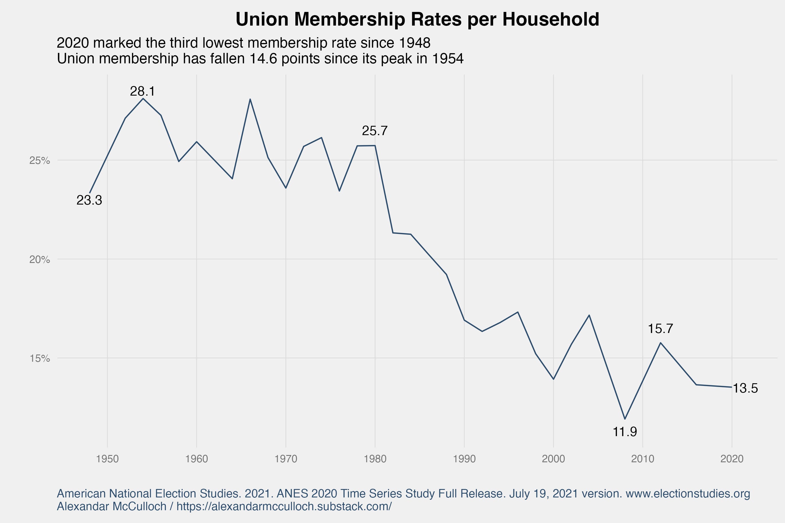 In the 1950s, over one-quarter of American households reported union membership. That number is now down to 13.5% in 2020. Most of this decline occurred between 1980 (25.7%) and 2000 (13.9%), a period defined by strong neo-liberal sentiment and Republican leadership.