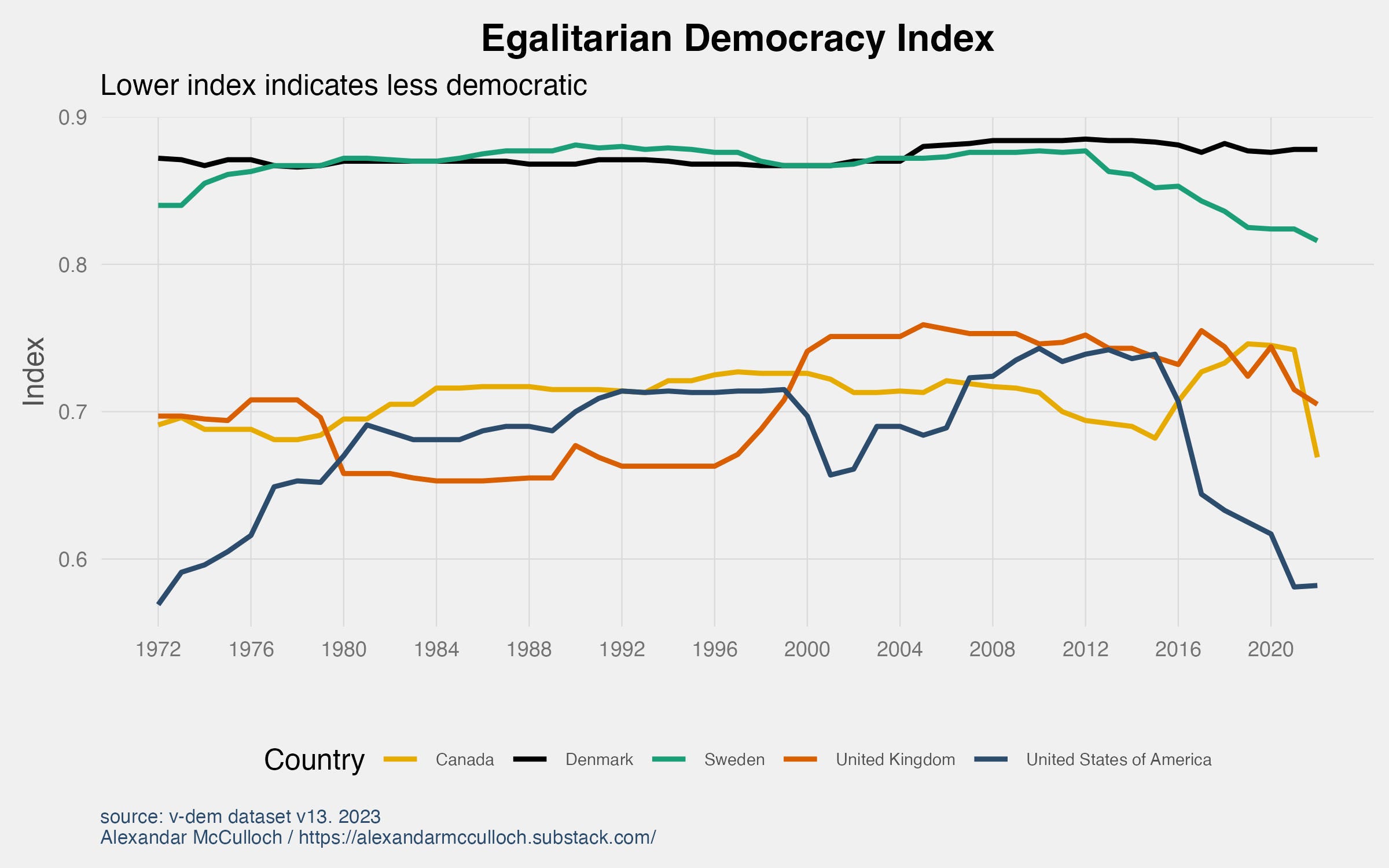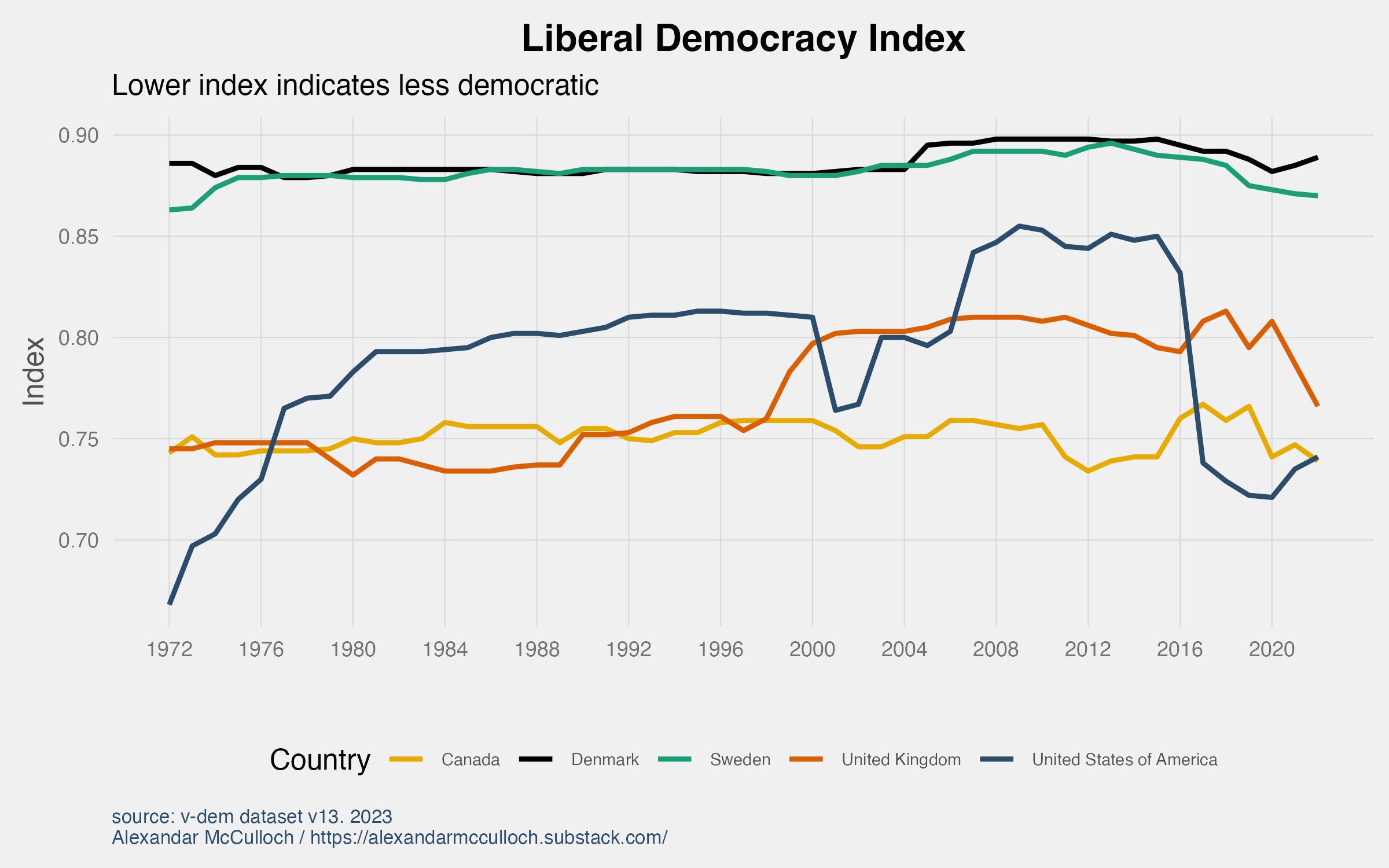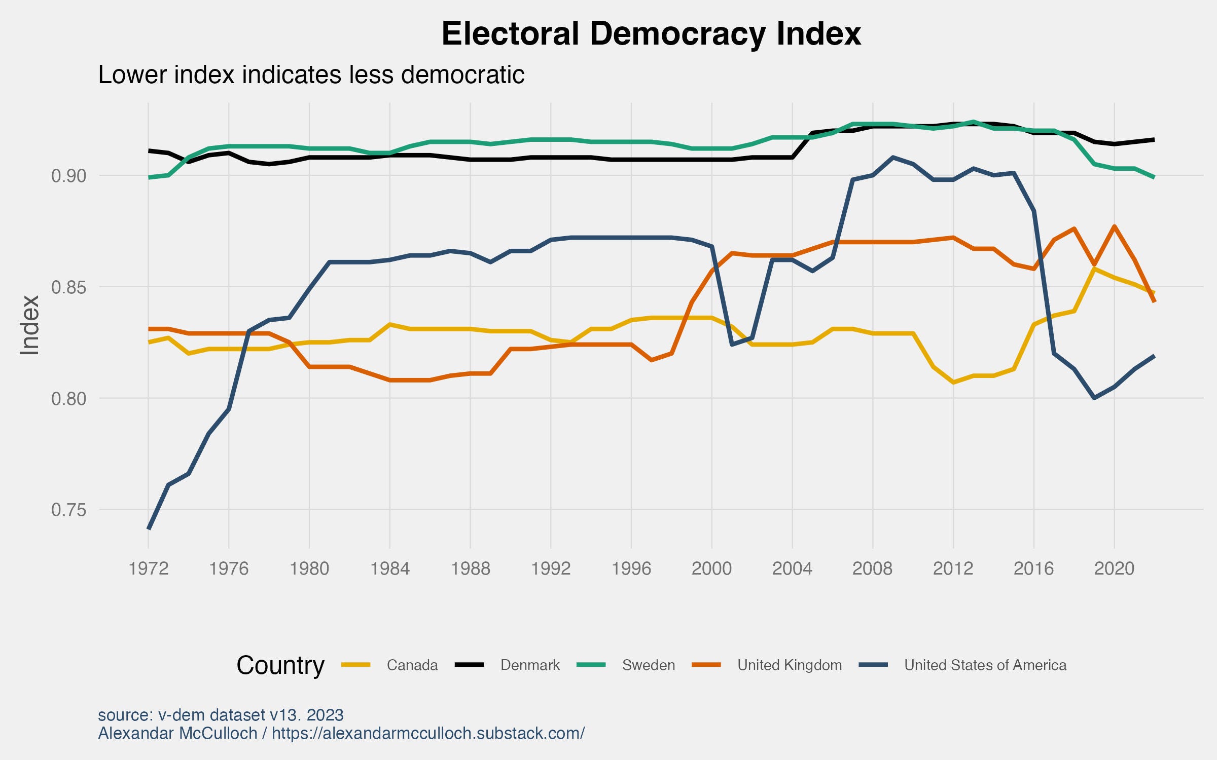In the year 2022, the United States received a score of 0.82 on this index. Notably, the graph illustrates that the US hasn’t encountered a score as low as this since 1976 when it was rated at 0.74. For contextual comparison, several other Western democracies such as Denmark, Sweden, and the United Kingdom have garnered higher ratings (with Denmark and Sweden ranking first and second in the world respectively).