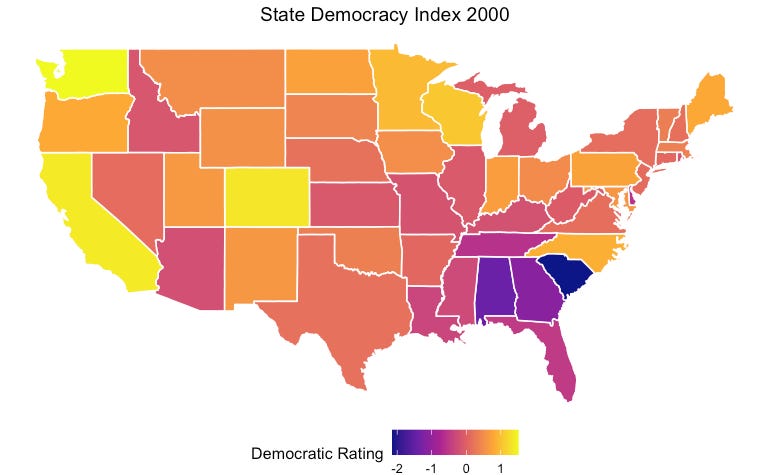 Given the substantial leeway granted to individual states in shaping their own voting laws, the logical progression in our analysis directs our attention toward state politics. As we pivot to another level of analysis, an interesting question emerges: Has this decline in democratic performance been uniformly experienced across the entire country, or is it primarily propelled by a handful of select states?