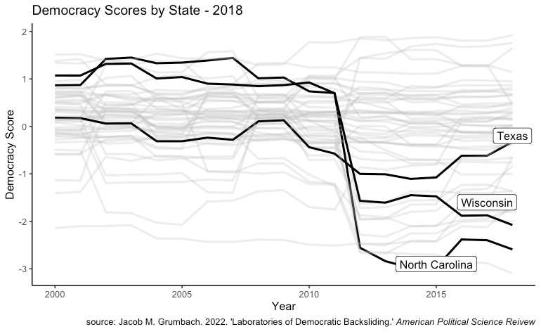 The graph below highlights an uneven democratic performance across states, indicating that not all voters have experienced a robust democratic environment within their respective states. Particularly noteworthy are instances in Texas and North Carolina where abrupt violations of democratic principles have been observed. Notably, North Carolina, once a trailblazer in expanding voting rights during the 1990s and early 2000s, took a sharp turn after the Republican Party gained control of the state’s legislature in 2010. Subsequently, South Carolina Republicans implemented district maps that gerrymandering scholar Christopher Warshaw called “the most gerrymandered map in modern history.”