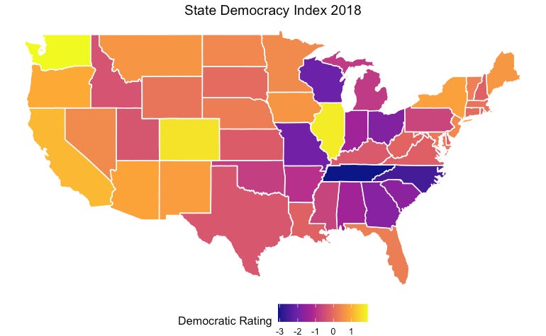 A noticeable extension of democratic decline can be observed, spanning from the southern states into certain areas of the Midwest. In 2000, Wisconsin stood as one of the strongest democratic states in the country; however, by 2018, it had descended to one of the five least-performing democracies.