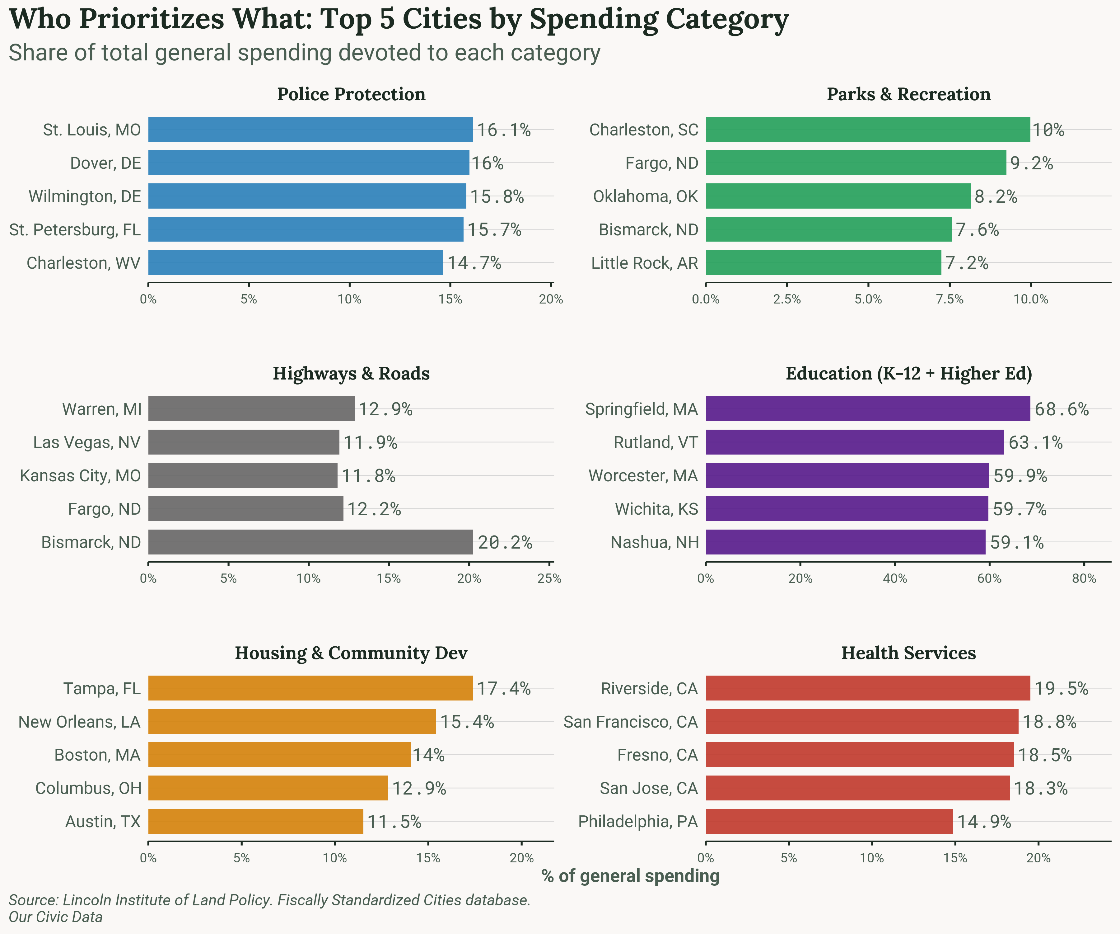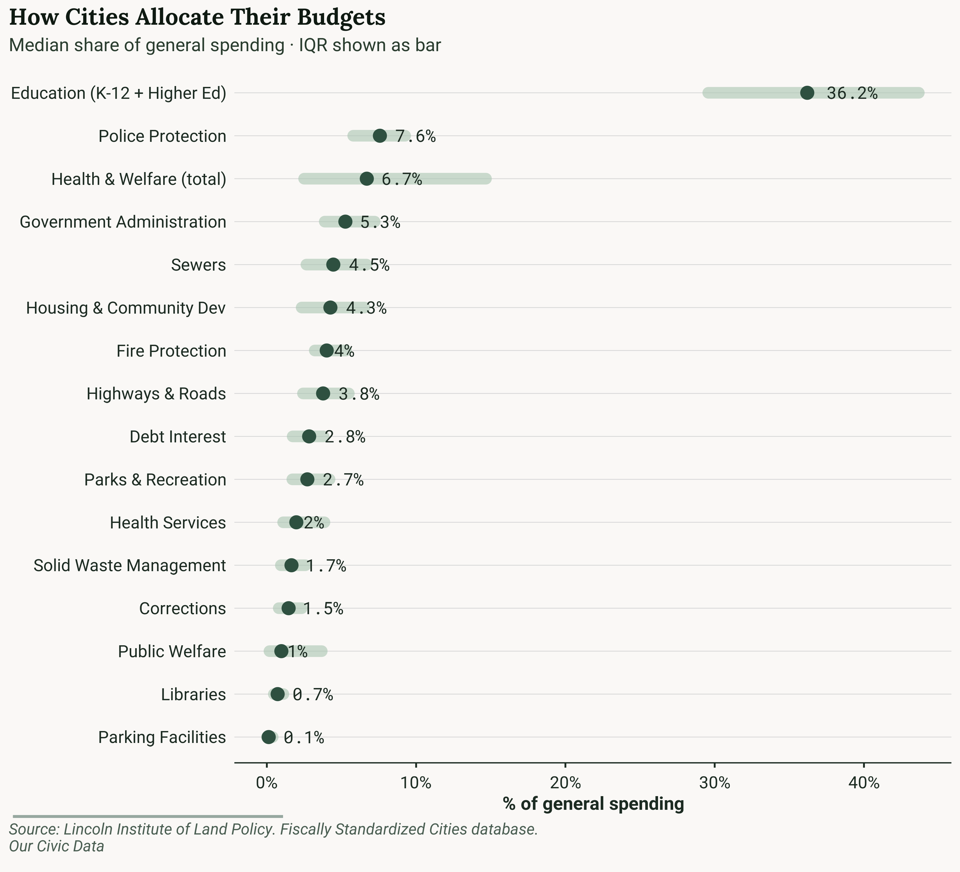 But medians obscure as much as they reveal. Education and health and welfare are not only the largest categories — they are also the most variable. Springfield, Massachusetts devotes 68.6% of its budget to education. Gulfport, Mississippi directs 71.3% of its budget to health and welfare. At the other end, some cities spend less than 10% on education and essentially nothing on health and welfare.