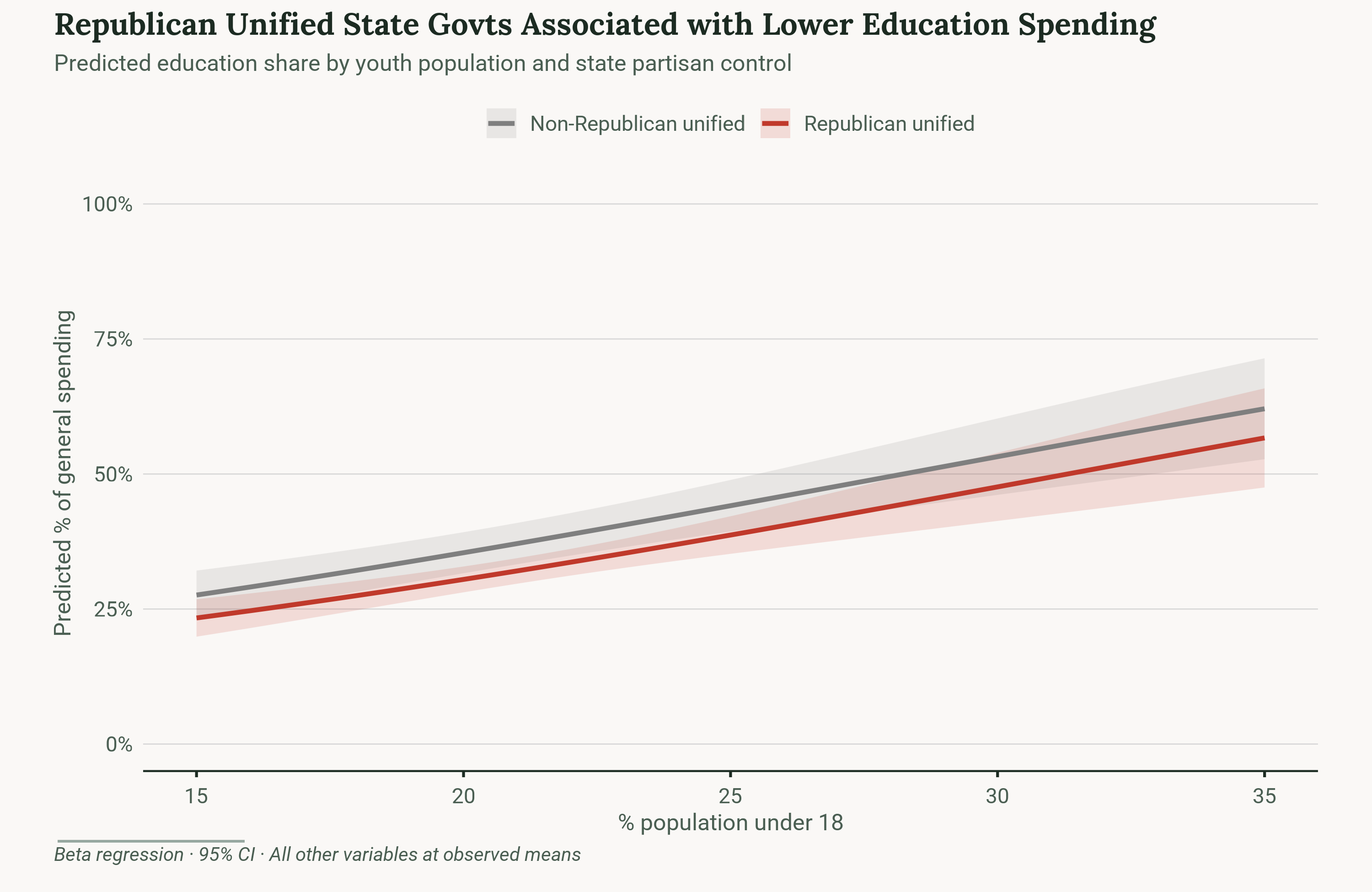 The political composition of the state matters too. Cities in states with unified Republican governments, where the GOP controls both legislative chambers and the governorship, spend approximately five percentage points less on education than cities in states with divided governments or Democratic control. This effect is independent of region, population density, income, and racial composition. It is worth being precise about what this finding does and does not say. It does not mean Republican-controlled cities spend less on education — the unit of analysis here is the state government, not the city government. A Democratic-majority city in a Republican-unified state still shows this reduced education share, suggesting that state-level policy decisions about school funding formulas, aid distribution, and local taxing authority shape city budgets even when the city itself leans the other direction.