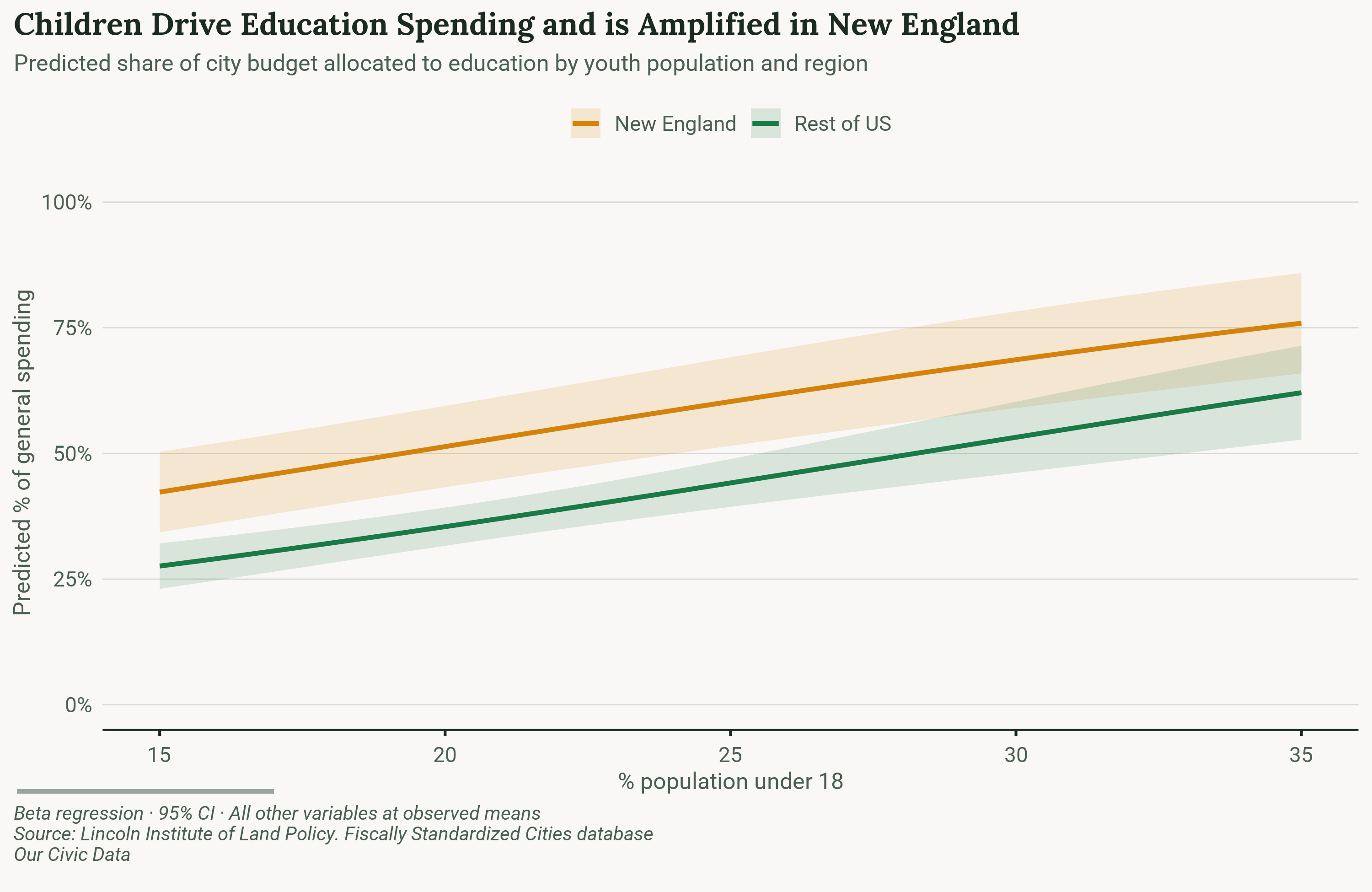 Region matters as well, and to a greater degree. New England cities allocate roughly 15 to 16 percentage points more of their budgets to education compared to cities elsewhere in the country. This reflects a longstanding regional tradition of strong local investment in public education, rooted in the town meeting model of governance and New England's historical reliance on local property taxes to fund schools. It is worth noting that this regional effect operates independently of whether a city has a city-run school district. Within New England, cities with independent school districts spend nearly as much as those where schools are formally part of the city government.