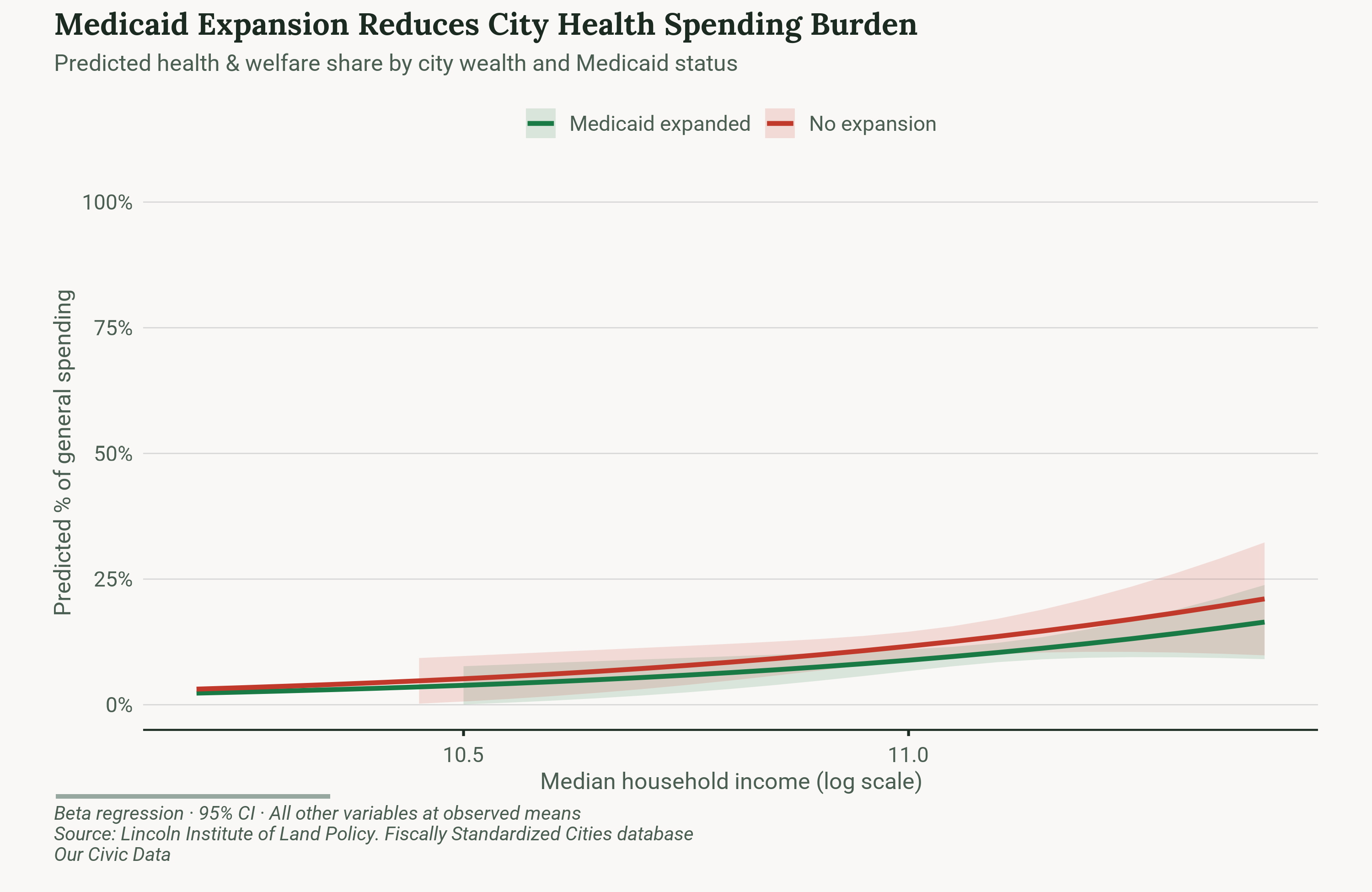 The single strongest predictor of a city's health and welfare spending share is whether its state expanded Medicaid under the Affordable Care Act. Cities in Medicaid expansion states spend approximately three percentage points less on health and welfare than cities in non-expansion states, after controlling for demographics, income, and population size. This finding reflects a real fiscal mechanism: when states expand Medicaid, they draw down federal dollars to cover low-income residents who would otherwise rely on city-funded health programs. The burden shifts up the governmental ladder, and city budgets reflect the relief.